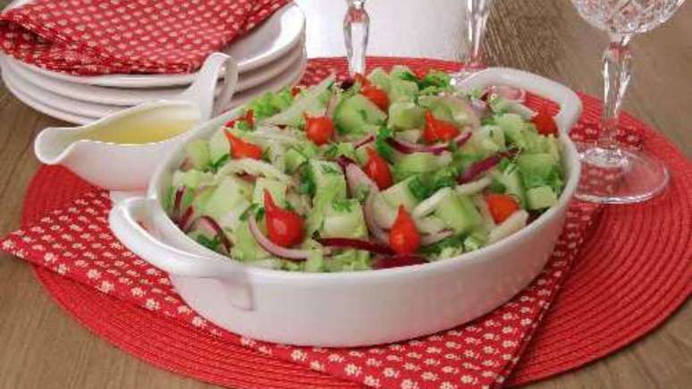 சாயோட்டைத் தவிர, சாலட்டில் சிவப்பு வெங்காயம், சார்ட், பிகுயின்ஹோ மிளகு மற்றும் எலுமிச்சை கூட உள்ளது. இந்த பொருட்களின் கலவையுடன், டிஷ் ஒரு மென்மையான மற்றும் மிகவும் சுவையான சுவையைப் பெறுகிறது. உங்களுக்கு பிடித்த புரதத்திற்கு ஒரு பக்க உணவாக பரிமாறவும் மற்றும் வண்ணமயமான மற்றும் சத்தான உணவை உருவாக்கவும்!