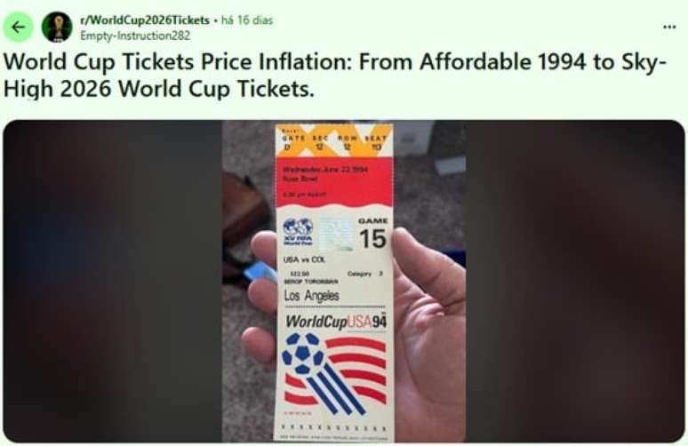 கேள்விக்குரிய அந்த போட்டிக்கு, ரசிகர் வெறும் 22.50 டாலர்களை செலுத்தினார், இது தற்போது 52 டாலர்களுக்கு சமமாக இருக்கும். ஒப்பிடும் நோக்கத்திற்காக, இந்த ஆண்டின் முதல் கட்டத்திற்கு செல்லுபடியாகும் யுனைடெட் ஸ்டேட்ஸ் x பராகுவே இடையேயான போட்டிக்கான டிக்கெட்டுகள் நூற்றுக்கணக்கான மற்றும் ஆயிரக்கணக்கான டாலர்கள் மதிப்புடையவை, இது நிறுவனத்திற்கு தலைவலியைக் கூட கொடுக்கிறது, ஏனெனில் போட்டிக்கான தேவை எதிர்பார்த்ததை விட குறைவாகக் கருதப்படுகிறது.