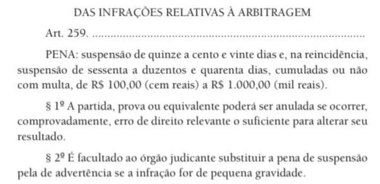 விளையாட்டு சட்டக் கண்ணோட்டத்தில், விவாதம் சட்டத்தின் பிழை என்ற கருத்தை நோக்கி நகரலாம். முறையான விதியின் தவறான பயன்பாடு இருக்கும்போது இந்த வகையான பிழை ஏற்படுகிறது, மேலும் ஏலத்தை விளக்குவதில் ஒரு எளிய பிழை அல்ல. இந்த தலைப்பு பிரேசிலிய விளையாட்டு நீதியின் கட்டுரை 259 இல் குறிப்பிடப்பட்டுள்ளது. முடிவை மாற்றுவதற்கு போதுமான சட்டப் பிழை இருந்தால், போட்டி ரத்துசெய்யப்படலாம் என்று விதி வழங்குகிறது.