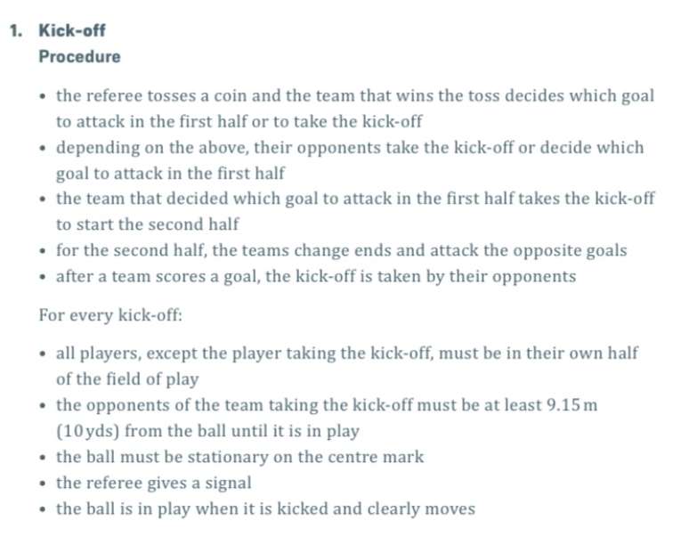 ஆட்டத்தின் விதிகளின் விதி 8, போட்டிக்கு முன் சீட்டுகள் மூலம் கிக்-ஆஃப் முடிவு செய்யப்படும் என்று கூறுகிறது.